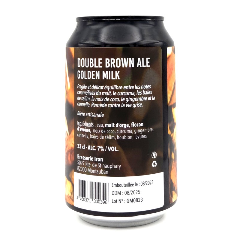 La brasserie IRON, créée en 2016 à Montauban, célèbre pour son originalité, vous propose encore une nouvelle curiosité! Leur Double Brown Ale Golden Milk est une preuve éclatante de leur audace,une base de brown ale riche et caramélisée, qui plonge directement dans un univers d’épices et d’exotisme. Au programme : curcuma, baies de sélim, noix de coco, gingembre et cannelle. Avec ses 7% d’alcool et son format 33cl, cette bière est une invitation à sortir des sentiers battus.